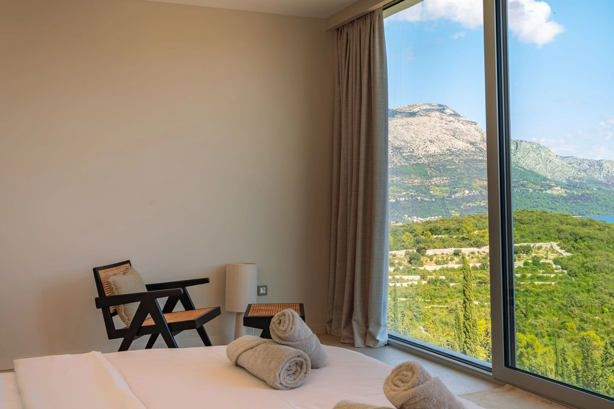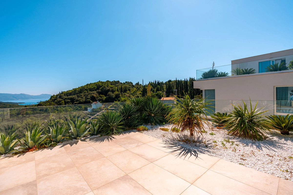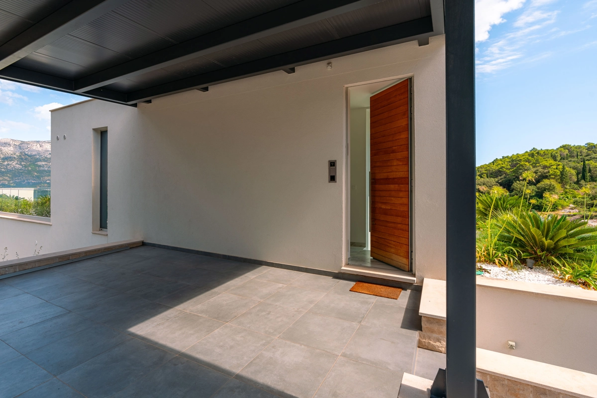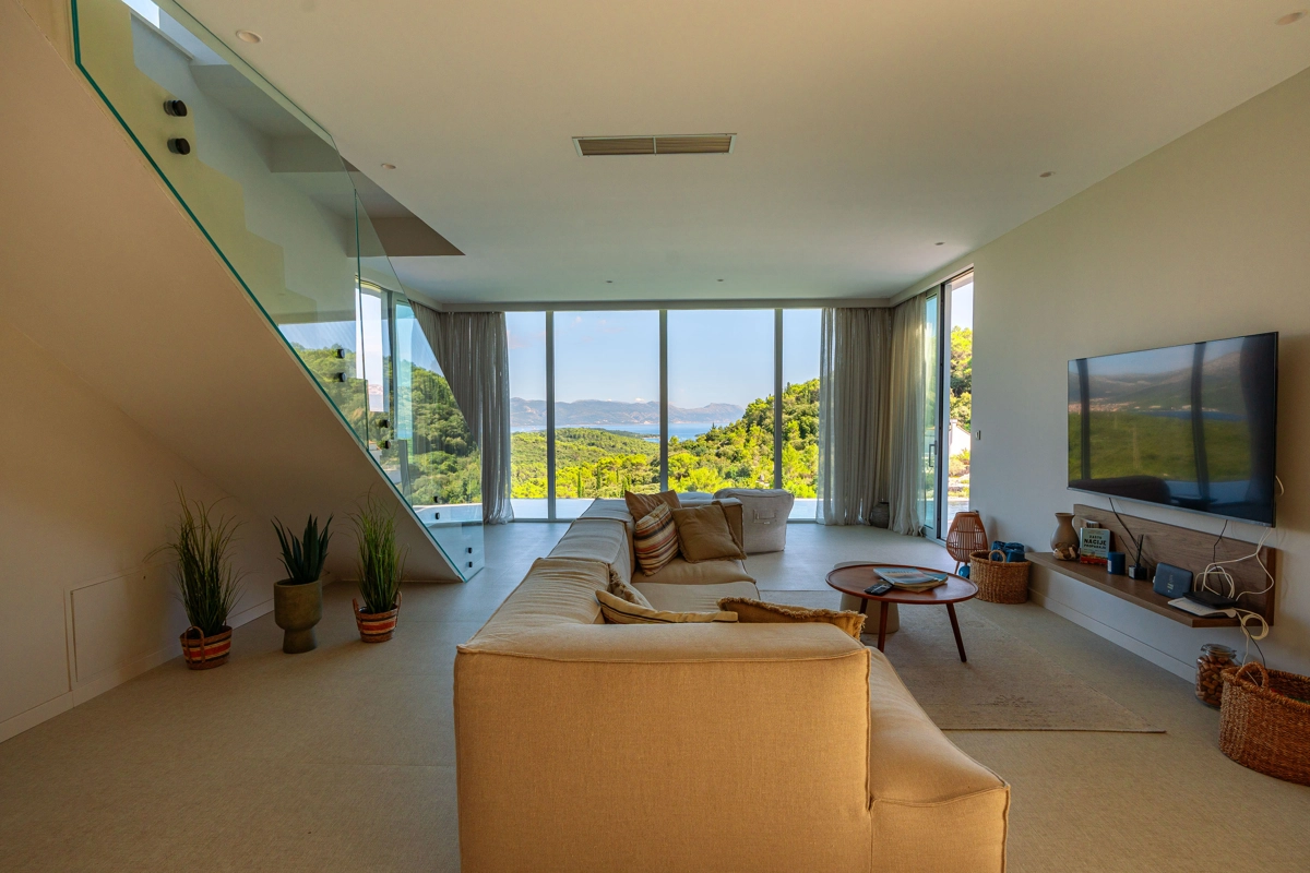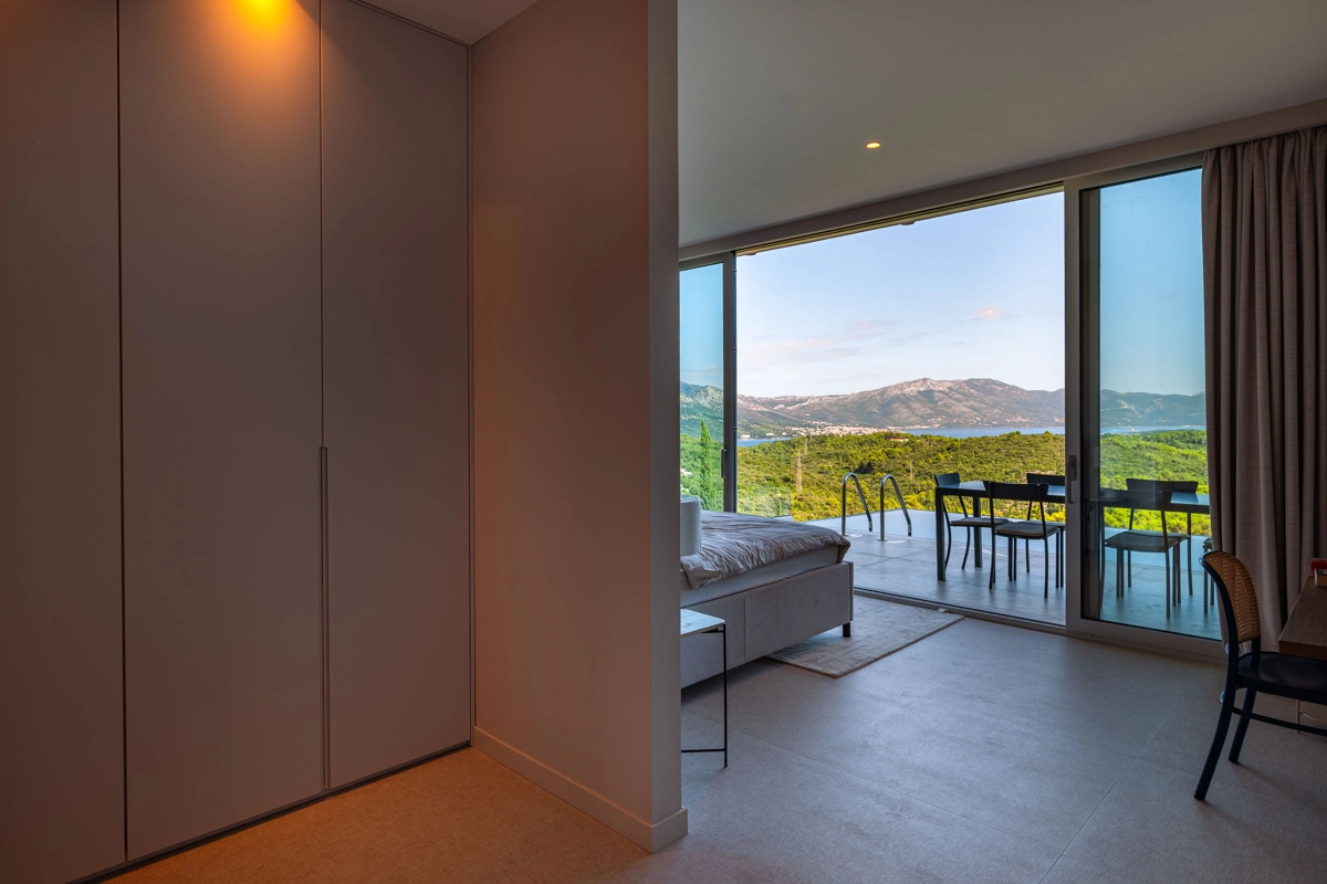 Suvremena arhitektura, minimalistički dizajn interijera i eksterijera. Iz vile se pruža prekrasan pogled na grad Korčulu, Badiju i zelenilo.