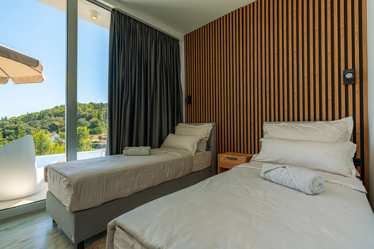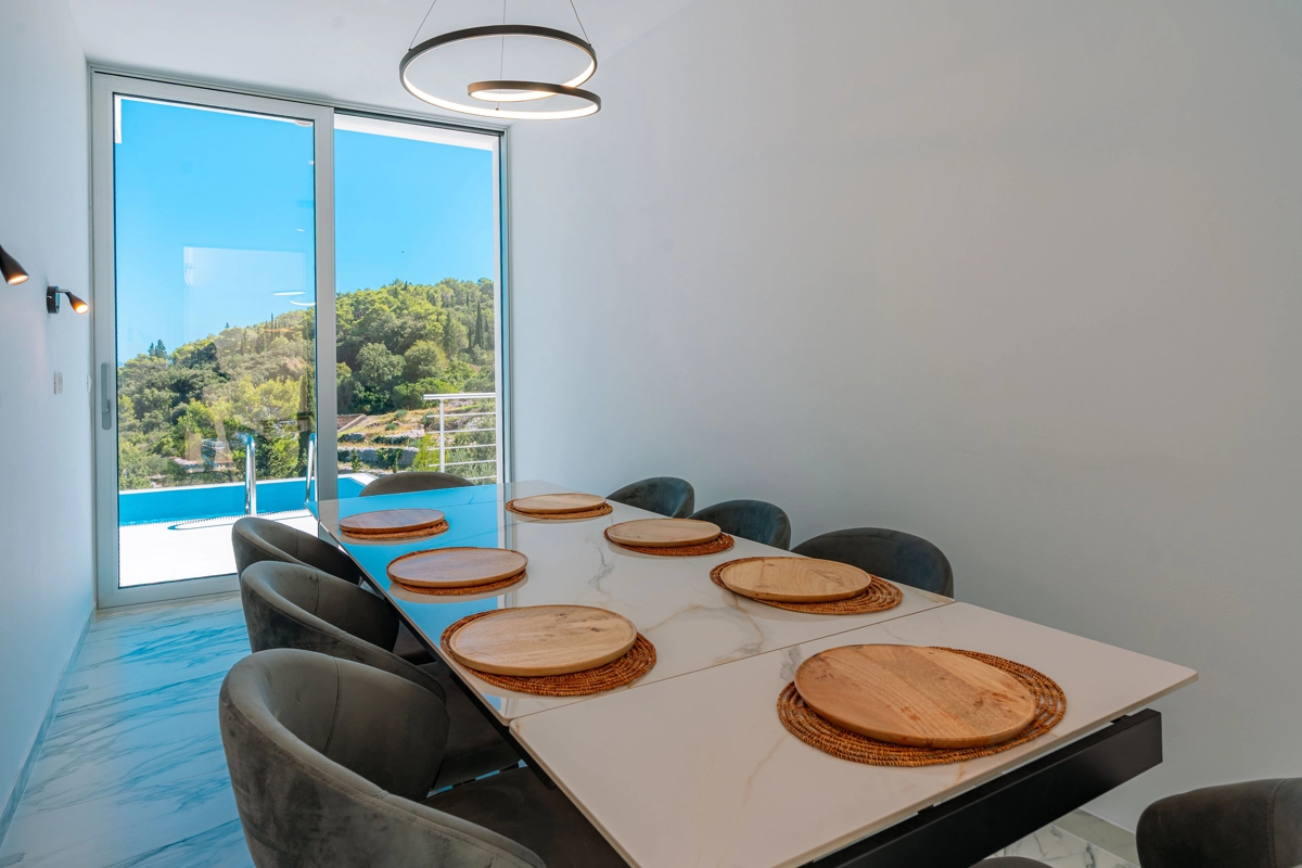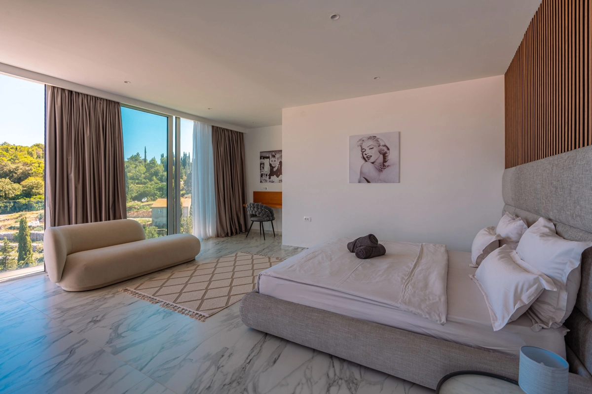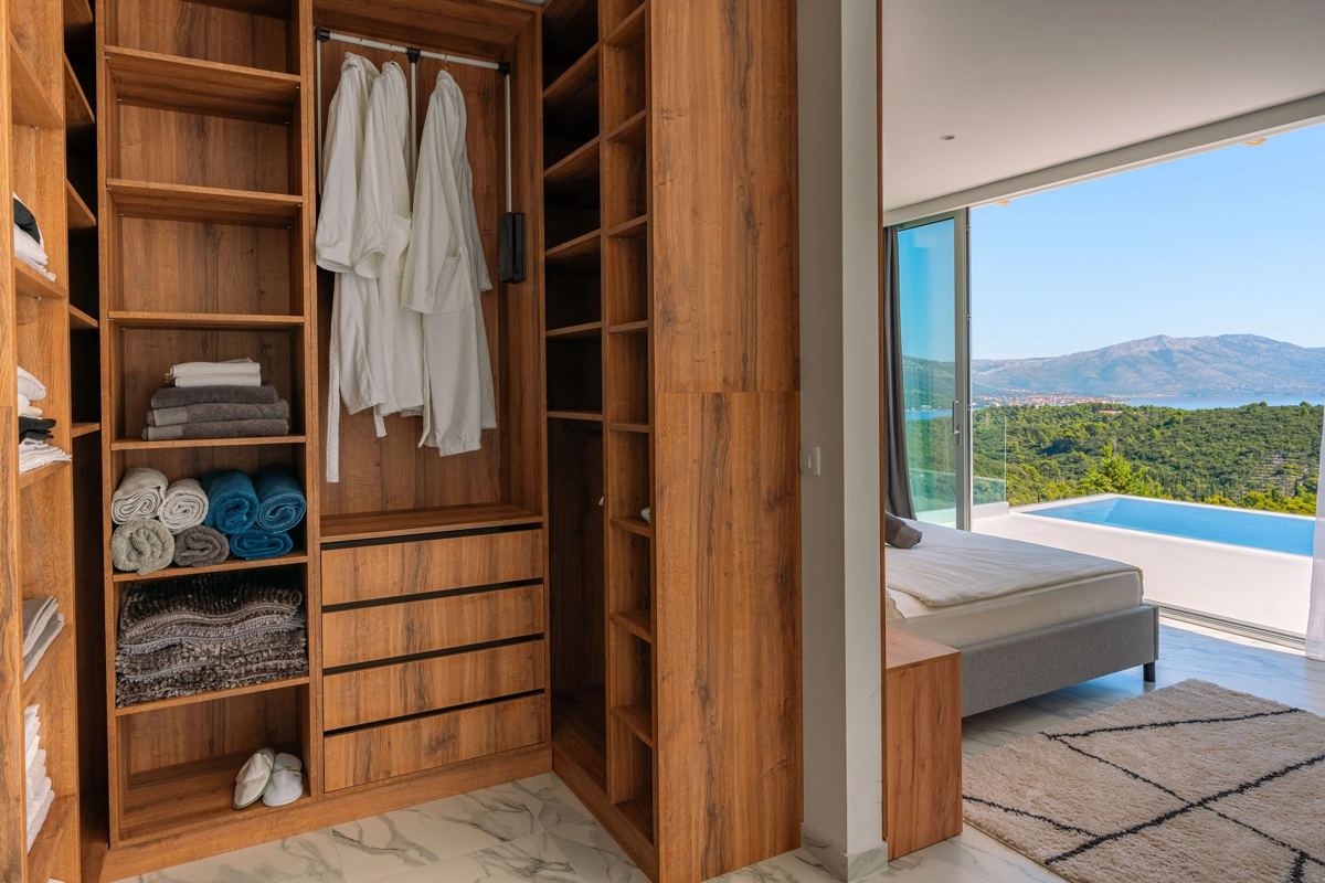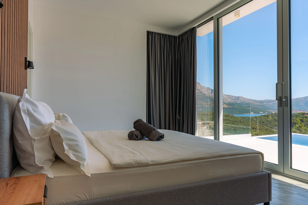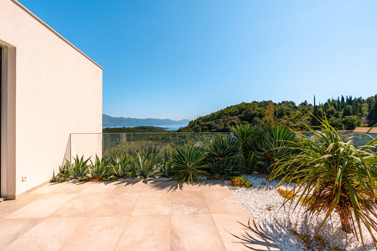 Suvremena arhitektura, minimalistički dizajn interijera i eksterijera. Iz vile se pruža prekrasan pogled na grad Korčulu, Badiju i zelenilo.