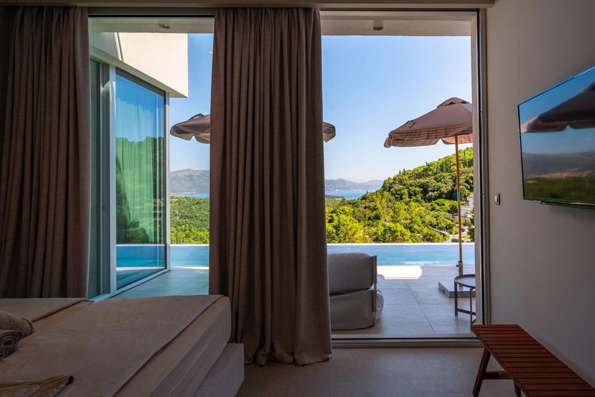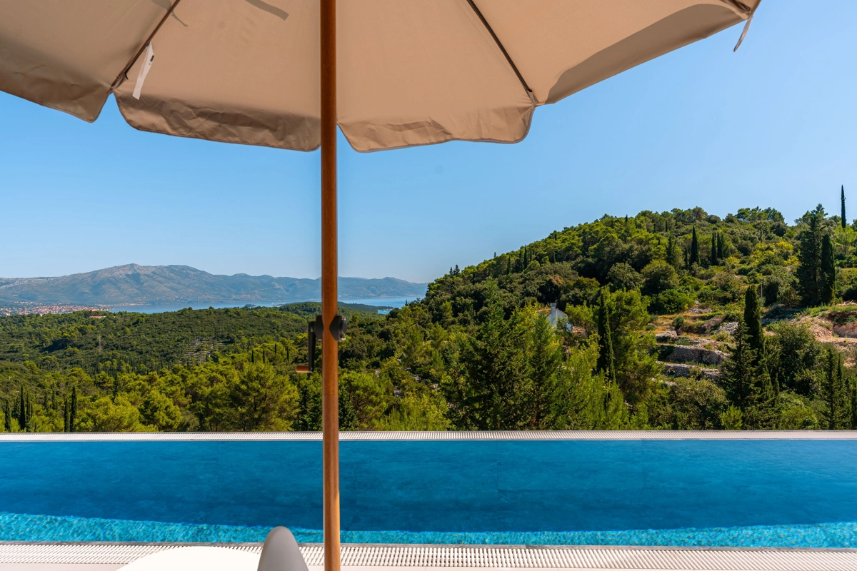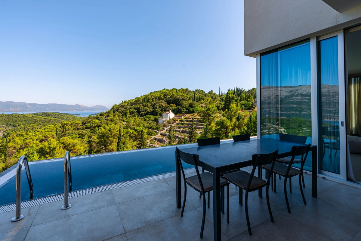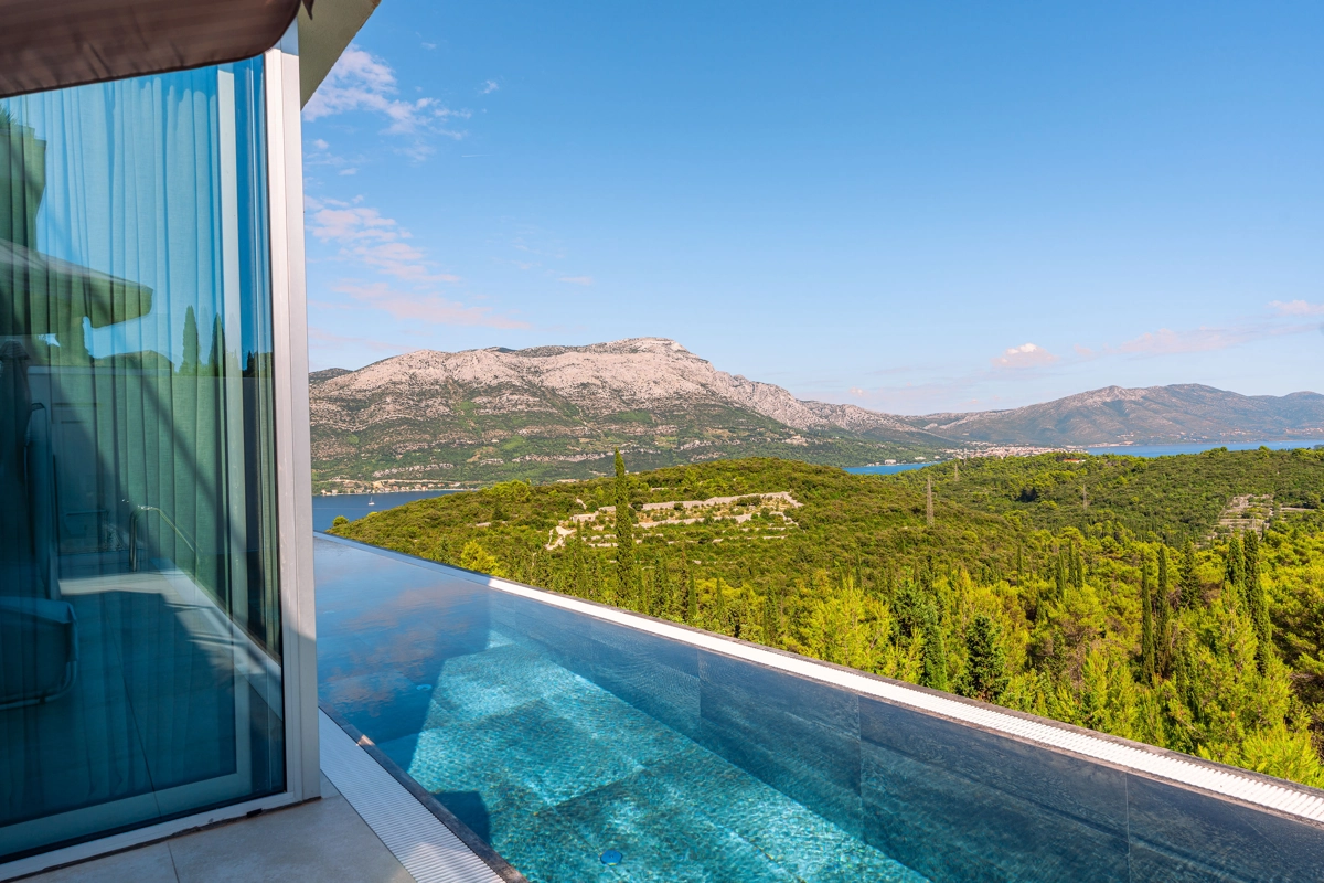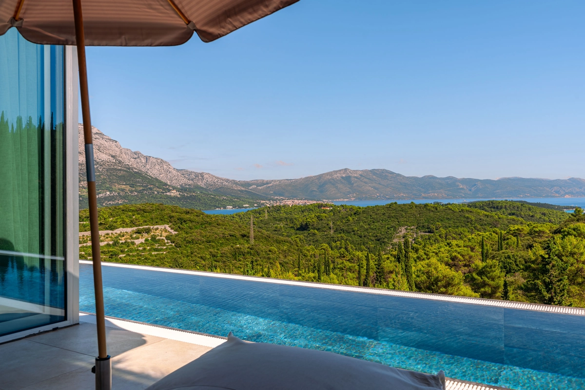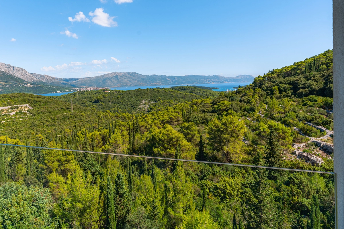 panoramski pogled iz svih prostorija vila, vrtova i terasa na stoljetnu borovu šumu, Pelješac i Korčulanski kanal
